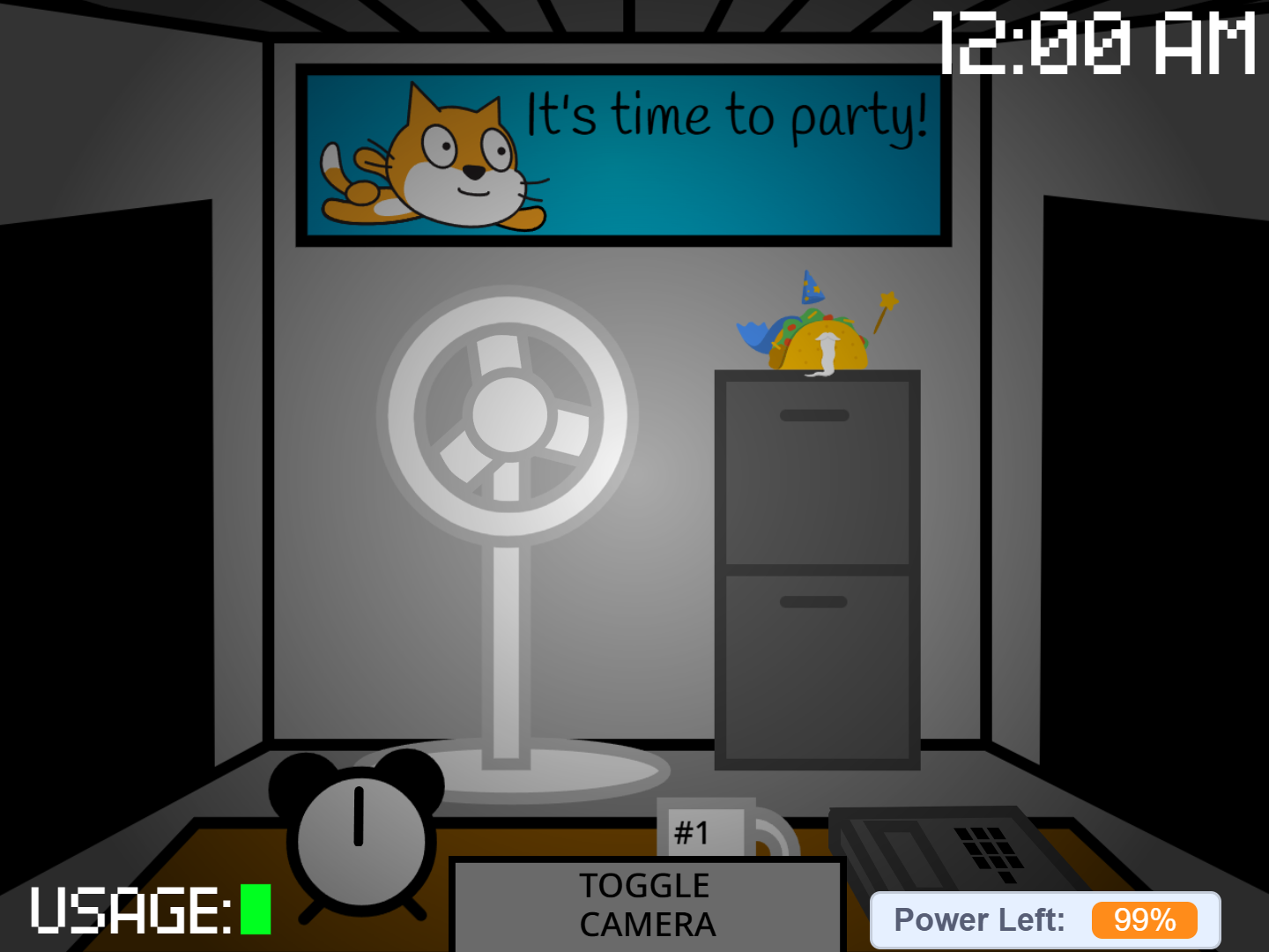 This game is a parody of Scott Cawthon's Five Nights at Freddy's. Though there is no grotesque imagery or backstory, there are still jumpscares if you happen to lose. If you are sensitive to flashing images and loud sounds, please refrain from playing this game.